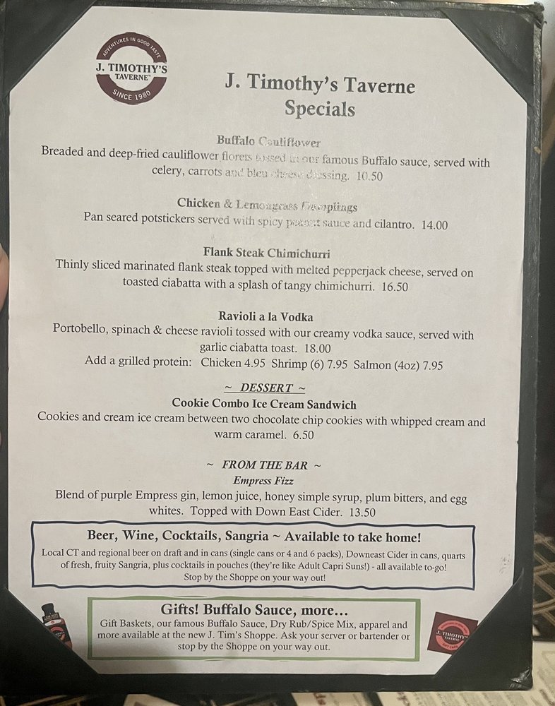 J Timothy's Taverne in Plainville, CT is a veteran-owned establishment offering a diverse menu with options for pescatarians, vegans, and vegetarians. The restaurant boasts a casual atmosphere with a full bar, outdoor seating, and happy hour specials. Known for their Buffalo Cheesy Cauliflower and Cordon Blue Steak & Cheese, the menu features creative dishes like the Buffalo Chicken Cobb Salad and Orange Crush Ice Cream Sandwich. Customers praise the friendly service and consistent quality of the food, with favorites like the Chicken Tostada salad and Gorgonzola Caesar salad plate. With a comfortable tavern atmosphere and attentive staff like server Bev, J Timothy's Taverne provides a satisfying dining experience for those looking for delicious pub fare.